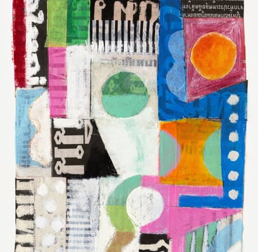 Mixed media - newspaper, tissue paper, acrylic paint on heavyweight paper 27.5 x 37.5cm Unframed